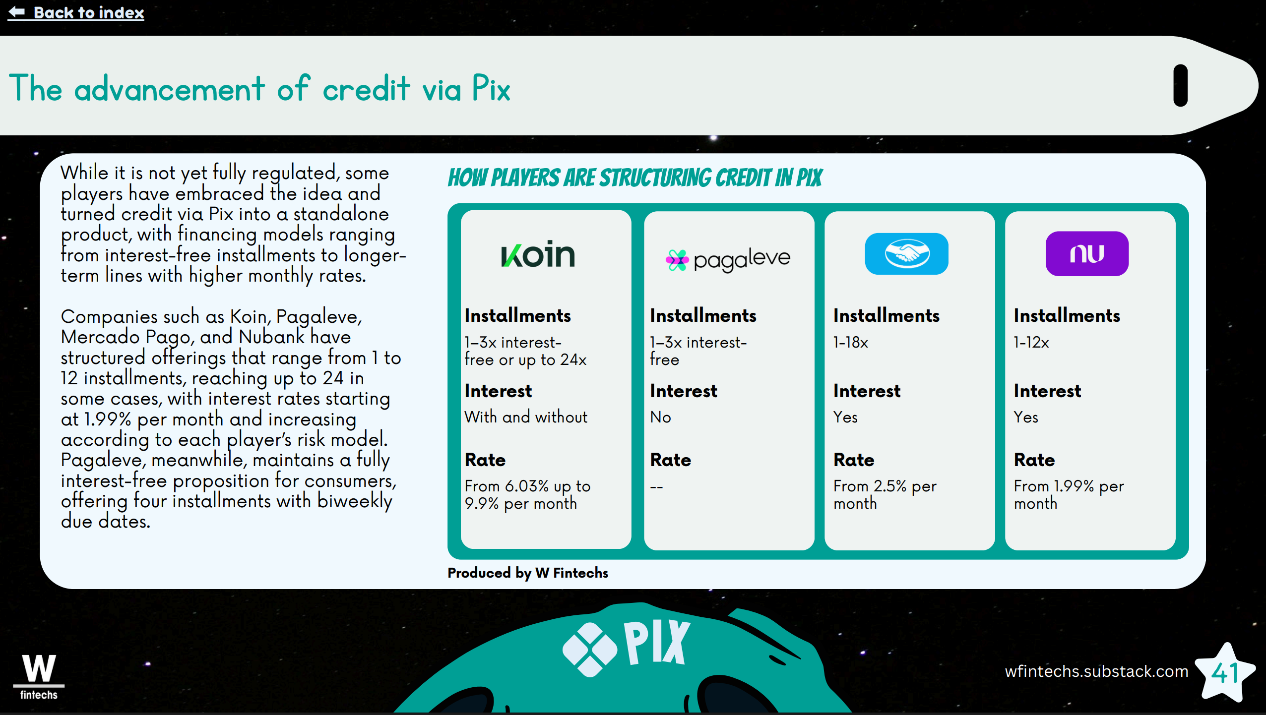 Another highlight is credit. We show how Pix began to serve as a starting point for financing purchases, and how players like Nubank, Mercado Pago, and Pagaleve are testing different models: four interest-free installments, and 12- or 24-installment plans with rates of up to 9 percent a month.