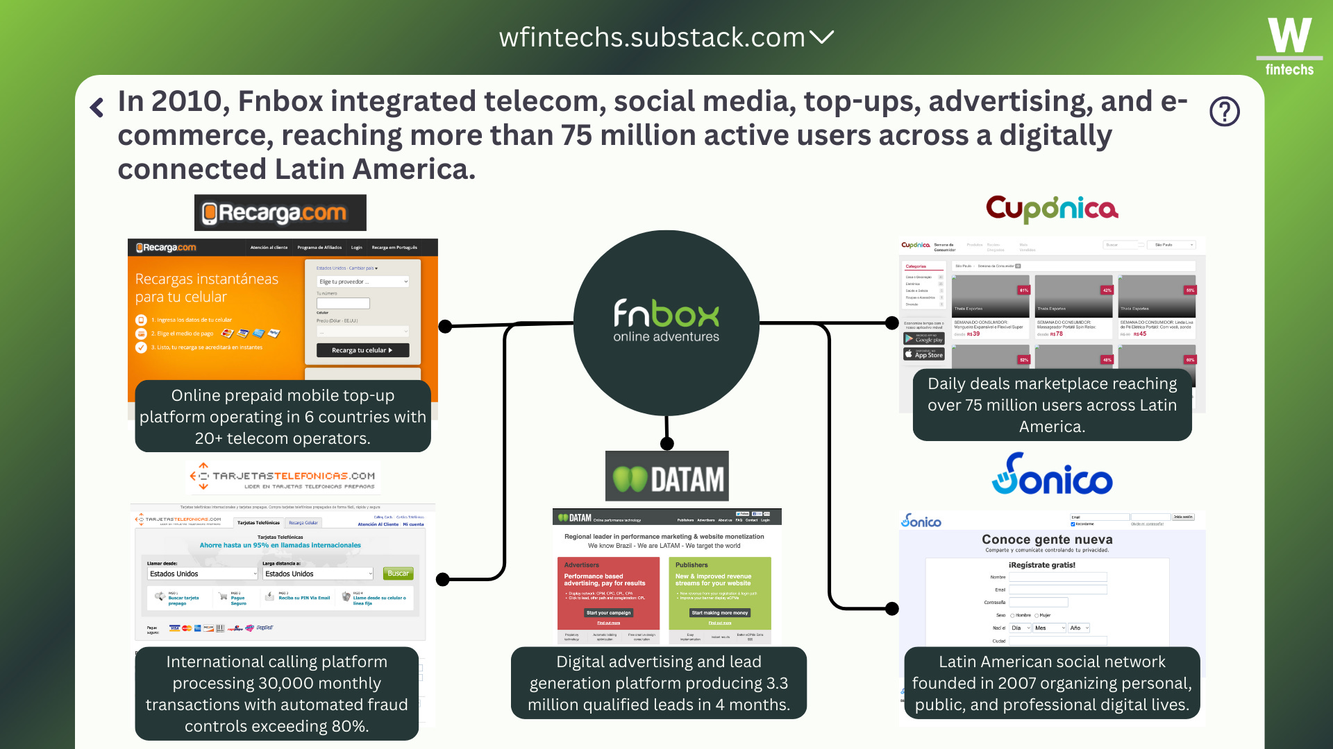 Na prática, a Fnbox operava simultaneamente negócios de telecom, mídia social, recarga, publicidade digital e comércio eletrônico, todos voltados para a comunidade latino-americana. Em 2010, esse conjunto de ativos já somava mais de 75 milhões de usuários ativos.