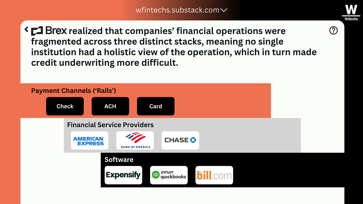 This initial design also revealed a deeper problem in the B2B financial system. Companies’ financial operations were fragmented across three distinct stacks: payment rails, banks, and software, forcing SMBs to operate with six or more different financial providers, with no single institution having a holistic view of the operation.